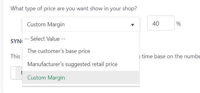 - Custom Margin = This is the Reseller's cost plus the percent margin. Example: if Reseller's cost is $10, then the price listed in Shopify would be $14 ($10 + 10*.4).